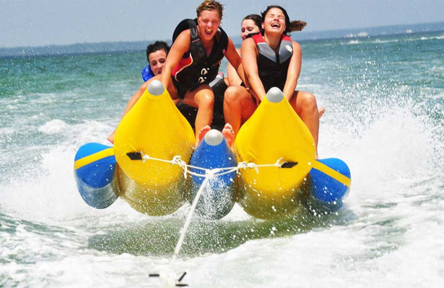 A banana boat ride is a fun and exciting way to enjoy the water with friends and family. Powered by a jet ski, the inflatable raft holds up to five people. Enjoy the rush of speed and splash of the sea while riding across clear blue waters. This is an exciting activity for groups looking for a little excitement.